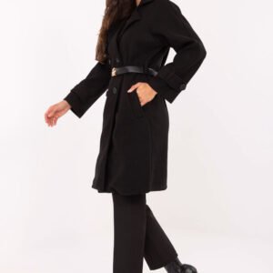 Elegancki płaszcz damski o długości przed kolano, doskonały na sezon przejściowy ? jesień, zimę i wiosnę. Wykonany z gładkiego poliestru, wyróżnia się klasycznym, ponadczasowym stylem. Posiada dwurzędowe zapięcie na guziki oraz pasek z możliwością zapięcia, który podkreśla talię i nadaje sylwetce eleganckiego kształtu. Wyposażony w praktyczne kieszenie wsuwane i długie rękawy, sprawdzi się zarówno na co dzień, do pracy, jak i podczas okazji wizytowych.