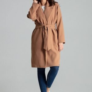 Beżowy klasyczny, prosty płaszcz z szerokimi klapami. Bez zapięcia, w pasie wiązany paskiem ozdobionym metalowym oczkami. Kieszenie wpuszczane w szwach bocznych, podszewka w kolorze płaszcza.