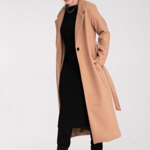 Klasyczny, długi płaszcz z eleganckim wykładanym kołnierzem i praktycznymi kieszeniami wsuwanymi. Zapinany na jeden guzik, z paskiem w pasie do wiązania, który podkreśla sylwetkę i dodaje szyku.