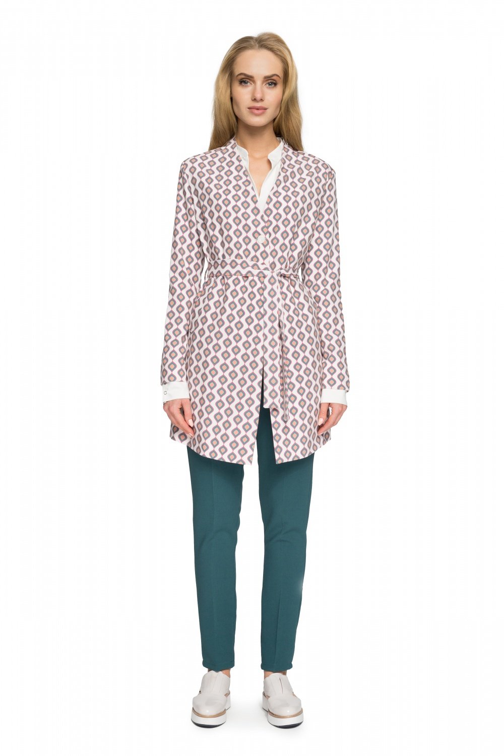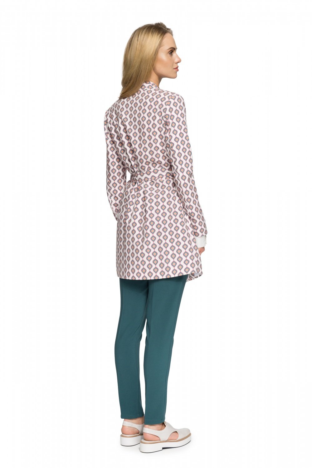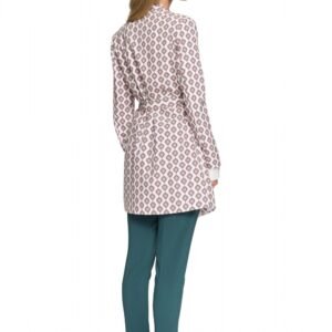Stylowy i bardzo kobiecy płaszcz z tkaniny z nadrukiem ochroni przed zimnem w chłodniejsze dni i będzie stanowił elegancki dodatek do sukienek, czy innych stylizacji ze spódnicą lub spodniami. W całości na podszewce, przewiązywany paskiem występuje w czterech wariantach kolorystycznych.