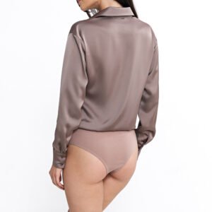 Body o regularnym kroju, wykonane z materiału o satynowym efekcie, który dodaje elegancji i subtelnego blasku. Posiada klasyczny kołnierzyk oraz długie rękawy zakończone mankietami, co nadaje całości ponadczasowego stylu. Zapięcie z przodu na guziki oraz zatrzaski w kroku zapewniają wygodę i łatwość noszenia. Dolna część, czyli majtki, wykonane są z elastycznego materiału, co gwarantuje idealne dopasowanie do sylwetki i komfort przez cały dzień. To body łączy w sobie klasyczny design z nowoczesnym wykończeniem, tworząc uniwersalny element garderoby.