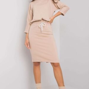 Komplet składający się z bluzy i spódnicy. Bluza z rękawem 3/4, u dołu ściągacz. Spódnica o ołówkowym kroju, w pasie troczek do wiązania.