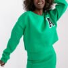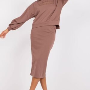 Komplet dresowy składający się ze spódnicy i bluzy. Bluza z długim rękawem, wkładana przez głowę. Spódnica z troczkiem do wiązania, po bokach kieszenie wsuwane.