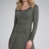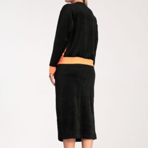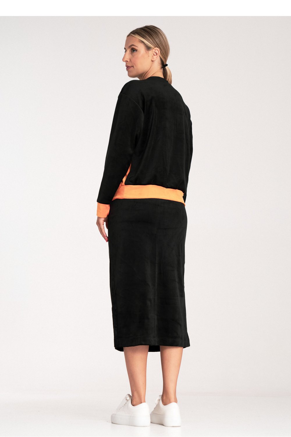 Welurowy komplet damski, składający się z dwukolorowej bluzy oraz spódnicy. Bluza z długim rękawem oraz okrągłym dekoltem. Ołówkowa spódnica z rozcięciem z prawej strony, w pasie wszyta szeroka guma, bez podszewki.