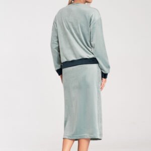 Welurowy komplet damski, składający się z dwukolorowej bluzy oraz spódnicy. Bluza z długim rękawem oraz okrągłym dekoltem. Ołówkowa spódnica z rozcięciem z prawej strony, w pasie wszyta szeroka guma, bez podszewki.