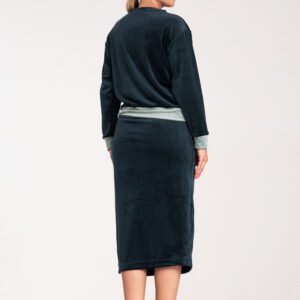 Welurowy komplet damski, składający się z dwukolorowej bluzy oraz spódnicy. Bluza z długim rękawem oraz okrągłym dekoltem. Ołówkowa spódnica z rozcięciem z prawej strony, w pasie wszyta szeroka guma, bez podszewki.