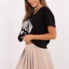 Casualowy komplet damski składający się z t-shirtu i spódnicy plisowanej, idealny na codzienne stylizacje. T-shirt wykonany z miękkiej bawełny z dodatkiem elastanu posiada krótki rękaw, dekolt w serek oraz modny nadruk na przodzie, który dodaje charakteru całej stylizacji. Spódnica mini z wysokim stanem wykonana jest z tego samego komfortowego materiału i posiada wszyte szorty, zapewniające swobodę ruchów. Plisowana konstrukcja nadaje lekkości i kobiecego wdzięku, tworząc zestaw, który łączy wygodę z modnym casualowym stylem.