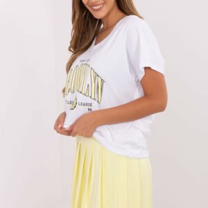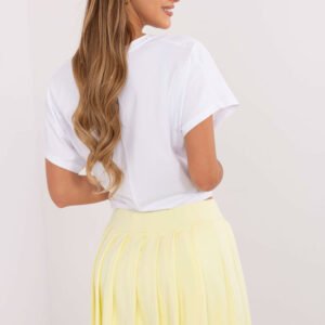Casualowy komplet damski składający się z t-shirtu i spódnicy plisowanej, idealny na codzienne stylizacje. T-shirt wykonany z miękkiej bawełny z dodatkiem elastanu posiada krótki rękaw, dekolt w serek oraz modny nadruk na przodzie, który dodaje charakteru całej stylizacji. Spódnica mini z wysokim stanem wykonana jest z tego samego komfortowego materiału i posiada wszyte szorty, zapewniające swobodę ruchów. Plisowana konstrukcja nadaje lekkości i kobiecego wdzięku, tworząc zestaw, który łączy wygodę z modnym casualowym stylem.