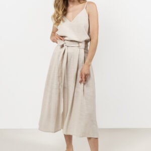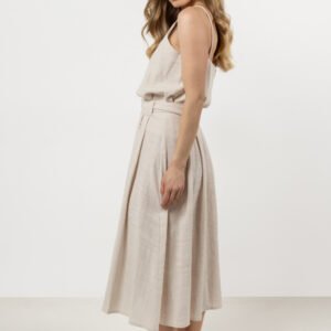 Klasyka i wygoda, ta spódnica to doskonałe połączenie stylu i komfortu. Rozkloszowany krój z zakładkami pięknie układa się w ruchu, a szeroki pas z szlufkami i paskiem podkreśla talię. Wykonana z naturalnej, miękkiej bawełny, zapewnia lekkość i przewiewność, idealnie sprawdzając się na co dzień i na wyjątkowe okazje. Dobierz do spódnicy top lub koszulę z tej samej tkaniny i stworzysz modny letni look.