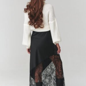 Postaw na styl, który łączy kobiecość z nowoczesnym charakterem. Asymetryczna spódnica z delikatną, koronkową wstawką to model, który przyciąga wzrok i dodaje pewności siebie. Gładka tkanina w górnej części pięknie kontrastuje z subtelną koronką u dołu, tworząc efekt lekkości i wyjątkowej elegancji. Idealna zarówno do ciężkich botków, jak i kobiecych szpilek, sprawdzi się w wielu stylizacjach, od casualowych po wieczorowe. Dostępna w dwóch kolorach: klasycznej czerni i głębokim odcieniu czekolady. Dzięki elastycznej talii doskonale dopasowuje się do sylwetki. Wyprodukowano we Włoszech.