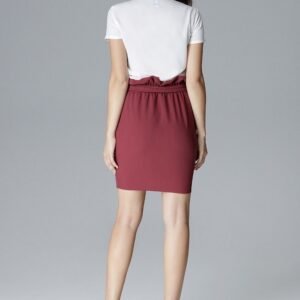 Fason dopasowany, lekko zwężany ku dołowi. Na linii bioder wsuwane kieszenie. Charakterystycznym wyróżnikiem spódnicy jest karbowana góra, która nadaje jej finezyjnego charakteru. Model na gumie z wiązanym paskiem.