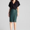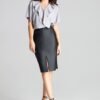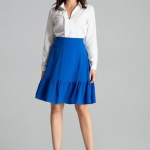 Szafirowa rozkloszowana spódnica za kolano z ozdobną falbaną w dolnej części. Zapinana z boku na kryty zamek. Spódnica bez podszewki i bez kieszeni.