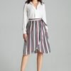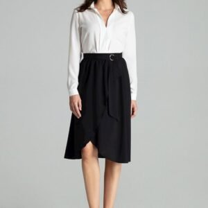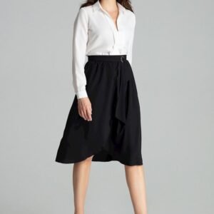 Czarna spódnica midi marszczona w pasie, zapinana na boczny kryty zamek. Kopertowy przód spódnicy. Z przodu pasek z ozdobną metalową klamrą w kolorze złotym. Sukienka bez podszewki i bez kieszeni.