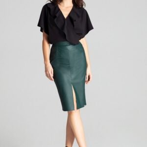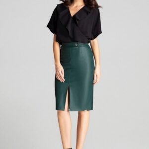 Zielona ołówkowa spódnica midi z eko-skóry. Zapinana z przodu na ozdobny zatrzask i z tyłu na kryty zamek. Bez kieszeni i bez podszewki. Z przodu, na środku delikatne rozcięcie.