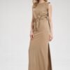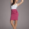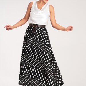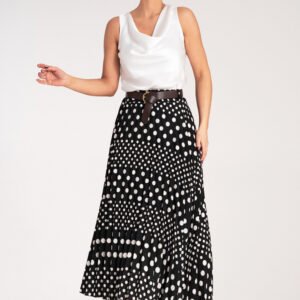Plisowana spódnica midi, ozdobiona wzorem w białe grochy. Model z wysokim stanem, subtelnymi marszczeniami i stylowym paskiem z klamrą, podkreślającym talię.