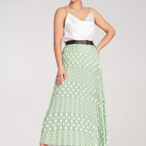 Plisowana spódnica midi, ozdobiona wzorem w białe grochy. Model z wysokim stanem, subtelnymi marszczeniami i stylowym paskiem z klamrą, podkreślającym talię.