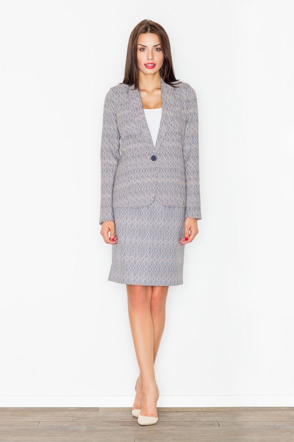 Prosta elegancka ołówkowa spódnica zapinana na kryty zamek. Spódnica z materiału w ciekawy wzór.