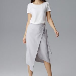 Asymetryczna spódnica, zakładana na lewy bok z wiązaniem w pasie. Idealnie skomponuje się do szpilek, botków czy kozaków.
