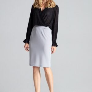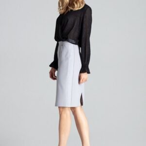 Szara klasyczna ołówkowa spódnica midi bez podszewki. Po bokach lampasy z brokatowego materiału. Zapinana z tyłu na kryty zamek, delikatne rozcięcie z tyłu.
