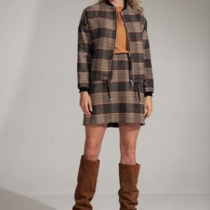 Trapezowa spódnica mini w kratę, z zaszewkami z przodu i z tyłu, bez kieszeni, zapinana z tyłu na kryty zamek, bez podszewki.