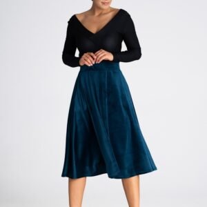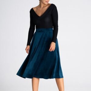 Elegancka midi spódnica podkreślająca wcięcie w talii. Pas elastyczny, a długość spódnicy sięga łydek i jest subtelnie rozkloszowana.