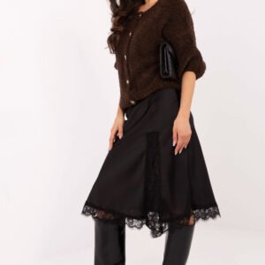 Elegancka spódnica midi o klasycznym, kobiecym kroju, idealna zarówno na co dzień, jak i na bardziej wizytowe okazje. Wykonana z wysokiej jakości tkaniny z dodatkiem elastanu, która delikatnie dopasowuje się do sylwetki, zapewniając komfort noszenia i swobodę ruchów. Model posiada wszytą gumę w pasie, dzięki czemu świetnie leży i nie wymaga zapięcia. Rozcięcie u dołu subtelnie podkreśla nogę, a koronkowe wykończenie nadaje całości elegancji i wyjątkowego charakteru. Spódnica w gładkim wzorze to uniwersalna propozycja, która doskonale sprawdzi się do pracy, na spotkania, jak i na specjalne okazje.