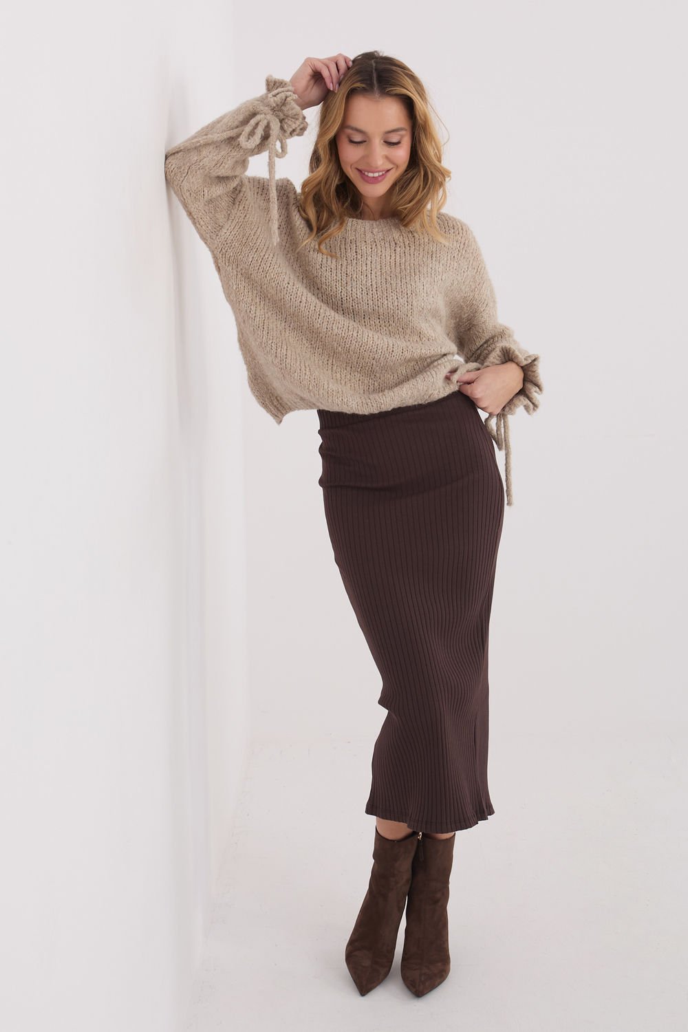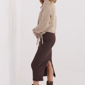Spódnica dzianinowa o długości midi, wykonana z miękkiego, prążkowanego materiału zapewniającego wysoki komfort noszenia. Model w stylu casual, doskonale sprawdzi się zarówno w codziennych stylizacjach, jak i jako element stroju do pracy. Gładki wzór nadaje jej uniwersalnego charakteru i ułatwia łączenie z różnymi fasonami bluzek czy swetrów. Z tyłu u dołu znajduje się praktyczne rozcięcie, które podkreśla sylwetkę i zapewnia swobodę ruchów. Spódnica została uszyta z bawełny z dodatkiem elastanu, dzięki czemu jest elastyczna, przyjemna w dotyku i dobrze dopasowuje się do figury. Brak zapięcia podkreśla prostą, wygodną formę modelu.