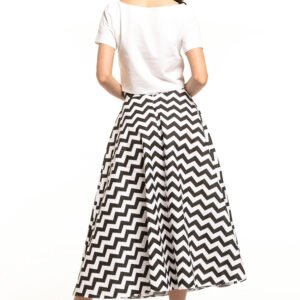„Spódnica midi, która stanowi ukłon w stronę lat pięćdziesiątych. Krój koła i materiał, którego używamy w tym projekcie, sprawiają, że spódnica wygląda rewelacyjnie w ruchu. Z tyłu ozdobny zamek. Ta spódnica komponuje się w eleganckim stylu, a także w swobodnym, a nawet sportowym stylu.”