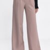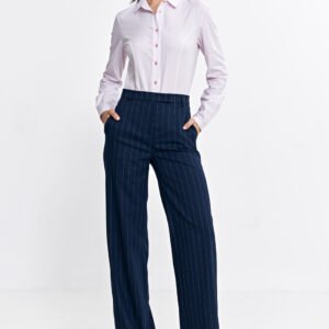 Damskie spodnie o dopasowanym kroju fit, wykonane z eleganckiego materiału z subtelnie kontrastującymi prążkami typu tenis, które dodają im szykownego wyglądu. Wysoki stan podkreśla talię, a nogawki typu bootcut, delikatnie rozszerzane ku dołowi, zapewniają stylowy i wydłużający sylwetkę efekt. Spodnie zapinane są na suwak oraz guzik ukryty pod plisą, co nadaje im minimalistyczny i schludny charakter. Z przodu znajdują się klasyczne kieszenie, a z tyłu imitacje kieszeni, które utrzymują elegancki wygląd. Dodatkowe szlufki umożliwiają noszenie paska, co dodaje wszechstronności stylizacji.