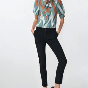 Czarne spodnie zapinane na napy dobrze wypadną w niejednej stylizacji mody biurowej. Dopasowany krój podkreśla kobiece kształty, a zapięcie na napy stanowi akcent przełamujący oficjalny styl. Przyjemny w dotyku materiał, z domieszką wiskozy, zapewnia wysoki komfort noszenia.