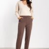 Eleganckie spodnie cygaretki z kantem. Fason dopasowany do figury. W pasie gumka ozdobiona falbanką z mereżką. Idealne na co dzień, świetnie wyglądają do eleganckich letnich szpilek. Możesz też do nich założyć t-shirt i espadryle. Uszyte są z lejącej tkaniny.