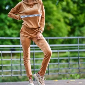 Spodnie z kieszeniami z przodu, wykonane z przyjemnego i ciepłego weluru. Mają elastyczny pas, oraz lekko zwężane nogawki, dzięki czemu dostosowują się do sylwetki i są bardzo wygodne w codziennym użytkowaniu. Z tyłu spodni znajduj się taśma lampasową z logiem naszej marki. Dostępne w 4 kolorach: beżowym, czarnym, bordowym i różowym. Produkt zaprojektowany i wyprodukowany w Polsce.