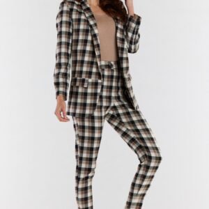 Dopasowane spodnie w kratę z wysokim stanem o kroju cygaretki, zwężane ku dołowi. Wysoki stan spodni podkreśla talię i wydłuża optycznie sylwetkę jednocześnie zakrywając drobne niedoskonałości w okolicy pasa. Razem z naszym żakietem A491 tworzy elegancki komplet garniturowy, który można wykorzystać na spotkanie biznesowe, uroczystość rodzinną czy do pracy w biurze. Dopasowane spodnie w kratę to must have w każdej szafie.