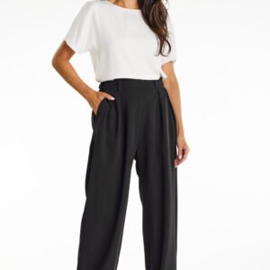 Eleganckie spodnie z szerokimi nogawkami z tkaniny. Odkryj elegancję i wygodę z naszymi spodniami o szerokich nogawkach w kolorze czarnym. Uszyte z wysokiej jakości tkaniny z wiskozą, łączą casualowy styl z wyrafinowanym wyglądem. Fason podkreślający talię oraz elastyczna gumka zapewniają doskonałe dopasowanie i komfort. Miękka, gładka tkanina z wiskozą sprawia, że spodnie są przyjemne w noszeniu. Wysoka jakość wykonania i trwałość gwarantowane przez markę Awama. Idealne do casualowych stylizacji z t-shirtem lub eleganckich zestawów z koszulą. Świetnie komponują się z różnym obuwiem, od trampek po kozaki. Produkt wyprodukowany w Polsce.