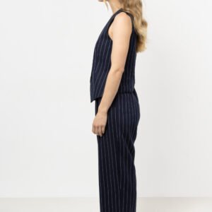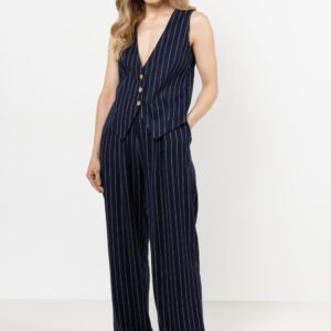 Spodnie lniane z szerokimi nogawkami w delikatne prążki Te spodnie to idealne połączenie elegancji i codziennego komfortu. Wykonane z lnu, zapewniają przewiewność i doskonale układają się na sylwetce. Szerokie nogawki dodają swobody, a elastyczna gumka w talii gwarantuje idealne dopasowanie. Klasyczny wzór cienkich pasków sprawia, że pasują do wielu stylizacji. Połącz lniane spodnie z kamizelką lub marynarką z tej samej tkaniny, a stworzysz elegancki letni look.
