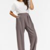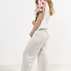 Spodnie lniane z szerokimi nogawkami w delikatne prążki Te spodnie to idealne połączenie elegancji i codziennego komfortu. Wykonane z lnu, zapewniają przewiewność i doskonale układają się na sylwetce. Szerokie nogawki dodają swobody, a elastyczna gumka w talii gwarantuje idealne dopasowanie. Klasyczny wzór cienkich pasków sprawia, że pasują do wielu stylizacji. Połącz lniane spodnie z kamizelką lub marynarką z tej samej tkaniny, a stworzysz elegancki letni look.