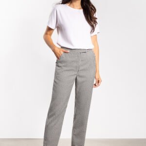 Eleganckie spodnie cygaretki w ponadczasowy wzór kraty łączą styl i wygodę. Prosty, dopasowany fason pięknie układa się na sylwetce, a średni stan zapewnia komfort przez cały dzień. Charakterystyczna kratka dodaje elegancji, dzięki czemu spodnie sprawdzą się zarówno w biurowych, jak i codziennych stylizacjach. Praktyczne kieszenie boczne zwiększają funkcjonalność, a uniwersalny design pozwala zestawiać je z koszulami, swetrami czy marynarkami, tworząc różnorodne, efektowne looki.