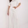 Spodnie damskie z wysokim stanem oraz szerokimi nogawkami. Spodnie w pasie mają wszytą gumę i wiązanie.