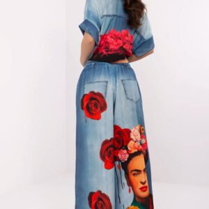 Stylowe spodnie palazzo, idealne na co dzień, wykonane z lekkiego materiału, zapewniającego komfort i swobodę ruchów. Te casualowe spodnie wyróżniają się kolorowym nadrukiem, który dodaje im unikalnego charakteru. Wykonane z wiskozy z dodatkiem poliestru, są przewiewne i miłe w dotyku. Mają wysoki stan, który podkreśla talię, oraz szerokie nogawki, nadające sylwetce lekkości i elegancji. Troczki do wiązania w pasie umożliwiają dopasowanie do indywidualnych potrzeb, zapewniając dodatkowy komfort. Idealne na co dzień, dodają stylu każdej casualowej stylizacji.