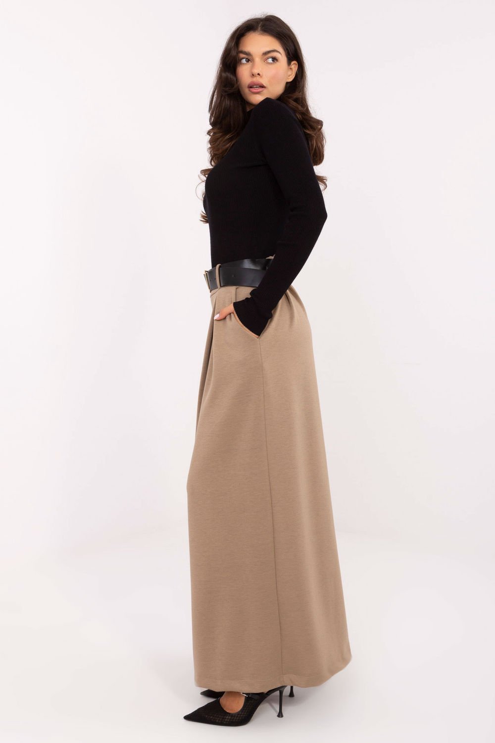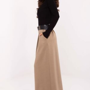 Eleganckie spodnie damskie typu palazzo, doskonałe na co dzień i do pracy. Uszyte z mieszanki wiskozy i poliestru, wyróżniają się gładką strukturą oraz komfortem noszenia. Wysoki stan z wszytą gumą i zapinanym paskiem podkreśla talię, a ozdobne zakładki dodają całości szyku. Szerokie nogawki nadają lekkości sylwetce, a praktyczne boczne, wsuwane kieszenie zapewniają funkcjonalność. To stylowa propozycja, która łączy elegancję z wygodą.