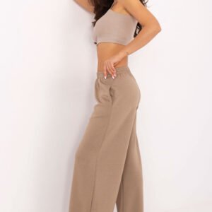 Damskie spodnie dresowe w stylu casual, idealne na co dzień i do relaksu w domu. Wykonane z miękkiego materiału typu masełko delikatnego, gładkiego i wyjątkowo przyjemnego w dotyku, z mieszanki wiskozy i poliestru. Model palazzo z wysokim stanem, szerokimi nogawkami i gumą w pasie zapewnia wygodę i swobodę ruchów, a boczne wsuwane kieszenie dodają funkcjonalności. Gładka faktura materiału sprawia, że spodnie łatwo zestawić z innymi elementami casualowej garderoby.