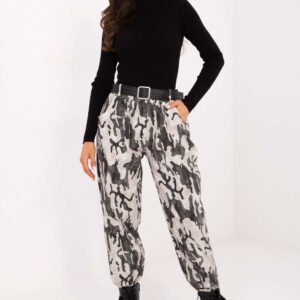 Damskie spodnie materiałowe w stylu casual, idealne na co dzień. Wykonane z mieszanki wiskozy, poliestru i elastanu, łączą wygodę z elastycznością i trwałością. Model z wysokim stanem, zwężanymi nogawkami i gumą w pasie zapewnia komfort noszenia, a zapinany pasek podkreśla talię. Boczne wsuwane kieszenie oraz modny wzór moro na całym materiale nadają spodniom nowoczesnego, wyrazistego charakteru.