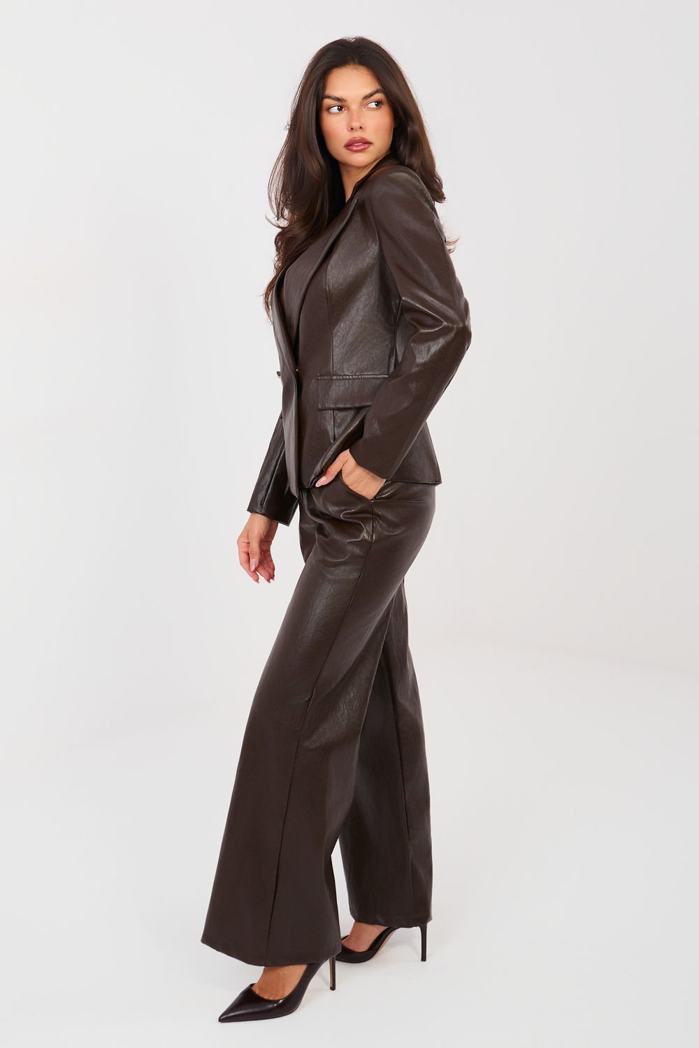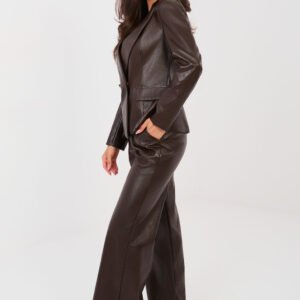 Stylowe spodnie damskie z eko skóry o fasonie wide leg to modna i uniwersalna propozycja do codziennych stylizacji oraz do pracy. Wykonane z wysokiej jakości materiału będącego połączeniem wiskozy i poliuretanu, łączą efektowny wygląd z komfortem noszenia. Model o gładkim wzorze i wysokim stanie pięknie podkreśla talię oraz optycznie wydłuża sylwetkę. Szerokie nogawki nadają spodniom nowoczesnego, swobodnego charakteru i zapewniają wygodę użytkowania. Praktyczne boczne kieszenie wsuwane zwiększają funkcjonalność modelu. Spodnie zapinane są na zamek oraz guzik, co gwarantuje dobre dopasowanie i stabilność. Idealne do zestawienia zarówno z elegancką bluzką i marynarką, jak i z casualowym swetrem czy topem.