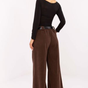 Stylowe spodnie materiałowe o eleganckim charakterze, idealne na co dzień i do pracy. Wykonane z miękkiego sztruksu o urozmaiconej fakturze materiału, zapewniają wyjątkowy komfort noszenia i modny wygląd. Model posiada wysoki stan oraz szerokie nogawki, które pięknie układają się na sylwetce, optycznie ją wysmuklając. W pasie wszyta jest elastyczna guma, gwarantująca wygodne dopasowanie, a zapinany pasek pozwala na dodatkową regulację obwodu. Spodnie nie posiadają zapięcia, co zwiększa komfort użytkowania. Boczne, wsuwane kieszenie dodają im funkcjonalności i klasy. To doskonały wybór dla kobiet ceniących połączenie elegancji, wygody i nowoczesnego stylu.