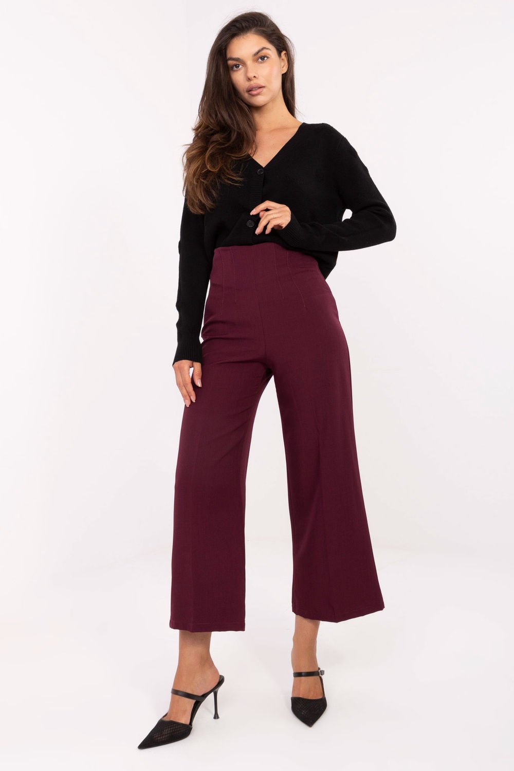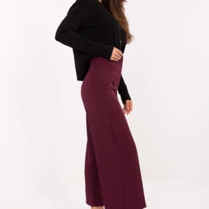 Eleganckie spodnie damskie typu kuloty to propozycja, która łączy styl i wygodę. Wykonane z wysokiej jakości poliestru z dodatkiem elastanu, są gładkie, lekkie i komfortowe w noszeniu. Model z wysokim stanem pięknie podkreśla talię, a szerokie nogawki nadają sylwetce lekkości i nowoczesnego charakteru. Spodnie zapinane są na kryty zamek umieszczony po lewej stronie, co gwarantuje estetyczne wykończenie. Brak kieszeni podkreśla elegancki, minimalistyczny styl. Idealne zarówno na co dzień, do pracy, jak i na okazje wizytowe ponadczasowe kuloty, które sprawdzą się w wielu stylizacjach.