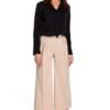 Woskowane spodnie z dzianiny z połyskiem z długimi prostymi nogawkami. Tkanina jest mocna i elastyczna przez co komfort użytkowania jest bardzo wysoki. Na linii bioder wpuszczane kieszenie, z tyłu naszywane kieszenie. Karczek zapinany na guzik i suwak, w talii szlufki.