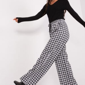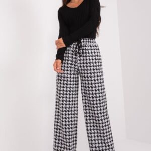 Spodnie materiałowe w casualowym stylu z wysokim stanem z wiązaniem w pasie oraz kieszeniami wsuwanymi. Spodnie z szerokimi nogawkami wykonane z materiału w kolorze szaroczarnym. Propozycja na wiele okazji.
