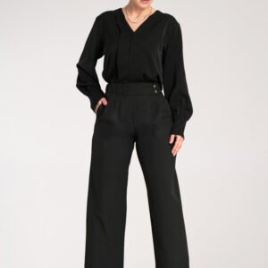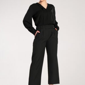 Eleganckie proste spodnie 7/8. Spodnie z wysokim stanem i ozdobnym panelem zapinanym na dwa guziki. Z przodu delikatne zakładki. Spodnie posiadają kieszenie wsuwane.