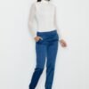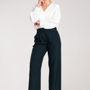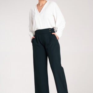 Eleganckie proste spodnie 7/8. Spodnie z wysokim stanem i ozdobnym panelem zapinanym na dwa guziki. Z przodu delikatne zakładki. Spodnie posiadają kieszenie wsuwane.