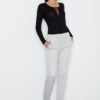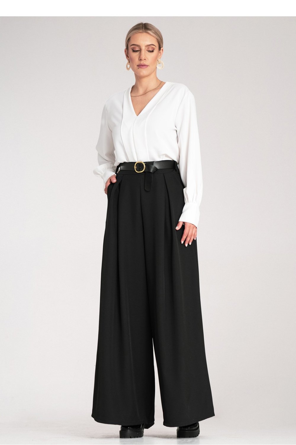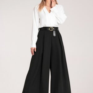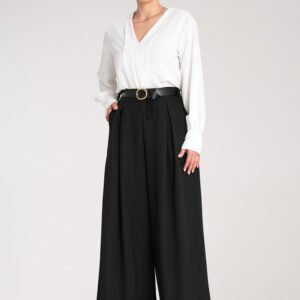 Spodnie typu palazzo z czarnym paskiem z klamrą. Wykonane z delikatnej tkaniny. Spodnie z wysokim stanem. Elastyczne w pasie z szeroką nogawką. Po bokach kieszenie wsuwane.